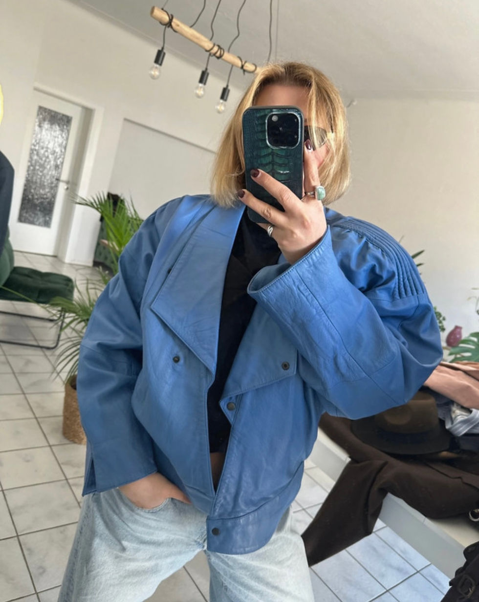 Der verkürzte Schnitt setzt die Taille perfekt in Szene, während der markante Kontrast aus zwei unterschiedlichen Stoffen dem Blazer seinen unverwechselbaren Charakter verleiht.