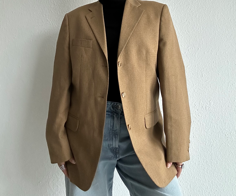Die Nähte sind gut gemacht, allerdings kann es zu leichten Längen-/Schulterunterschieden kommen, da die Jacke aus zwei recycelten Blazern besteht.